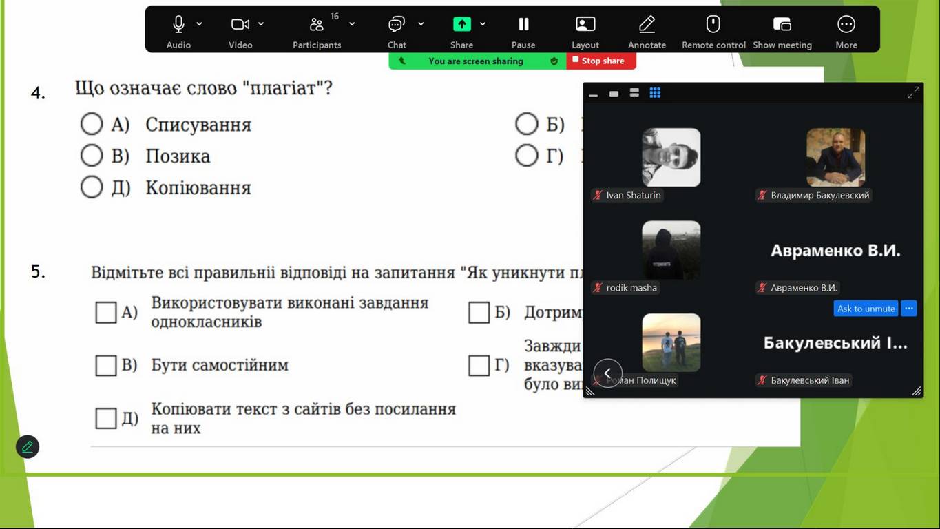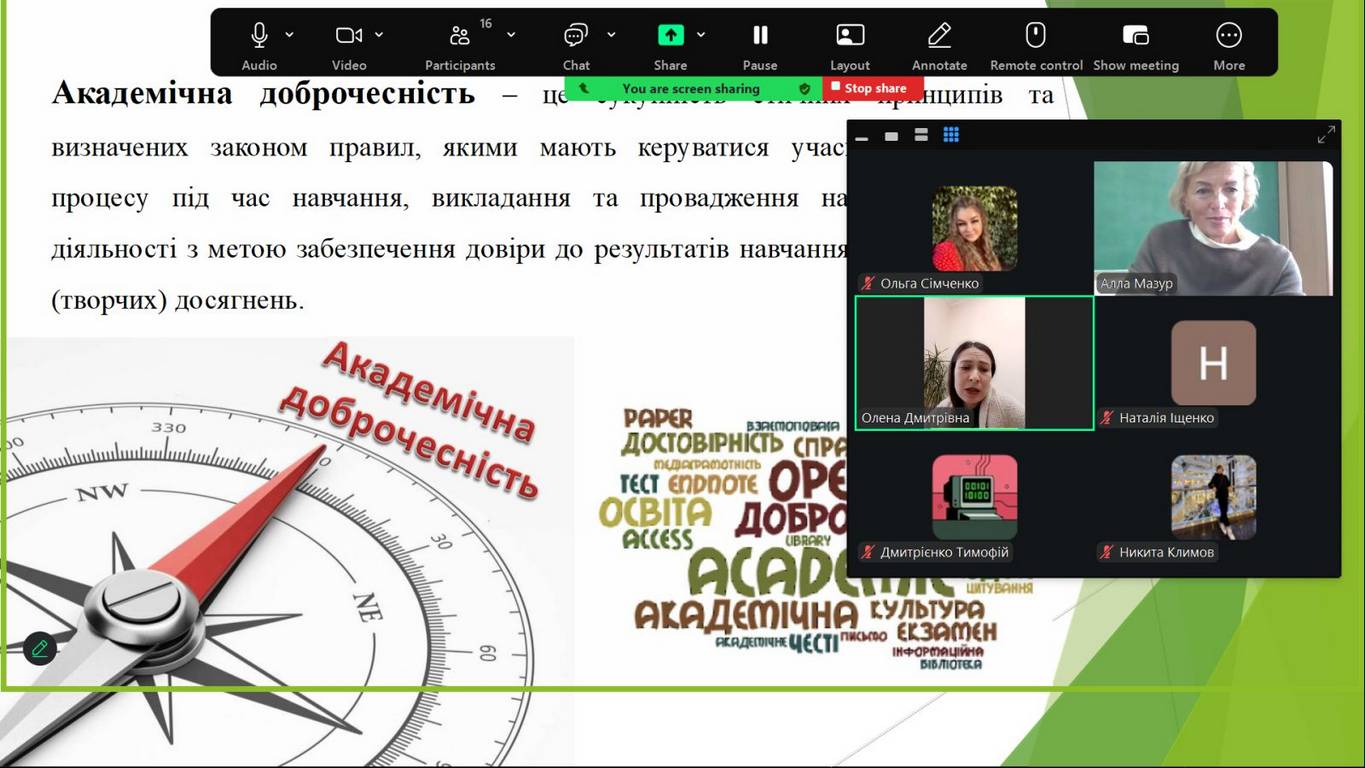 Окремо в кожній академічній групі були проведені бесіди з кураторами та викладачами щодо важливості дотримання принципів академічної доброчесності. Під час зустрічей обговорювались приклади академічних порушень, відповідальність за них та шляхи запобігання. Студентів було ознайомлено з Положенням про академічну доброчесність, чинними нормативними документами, а також з електронними сервісами для перевірки унікальності робіт.