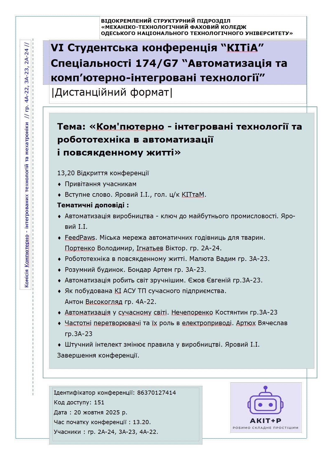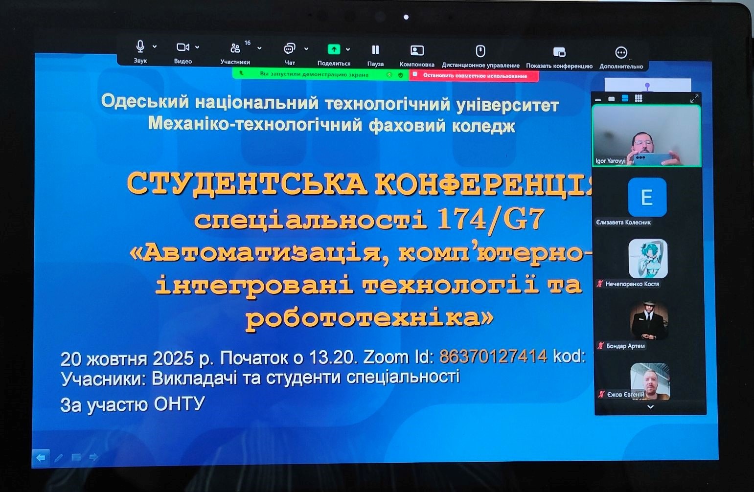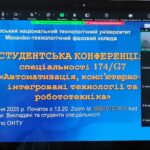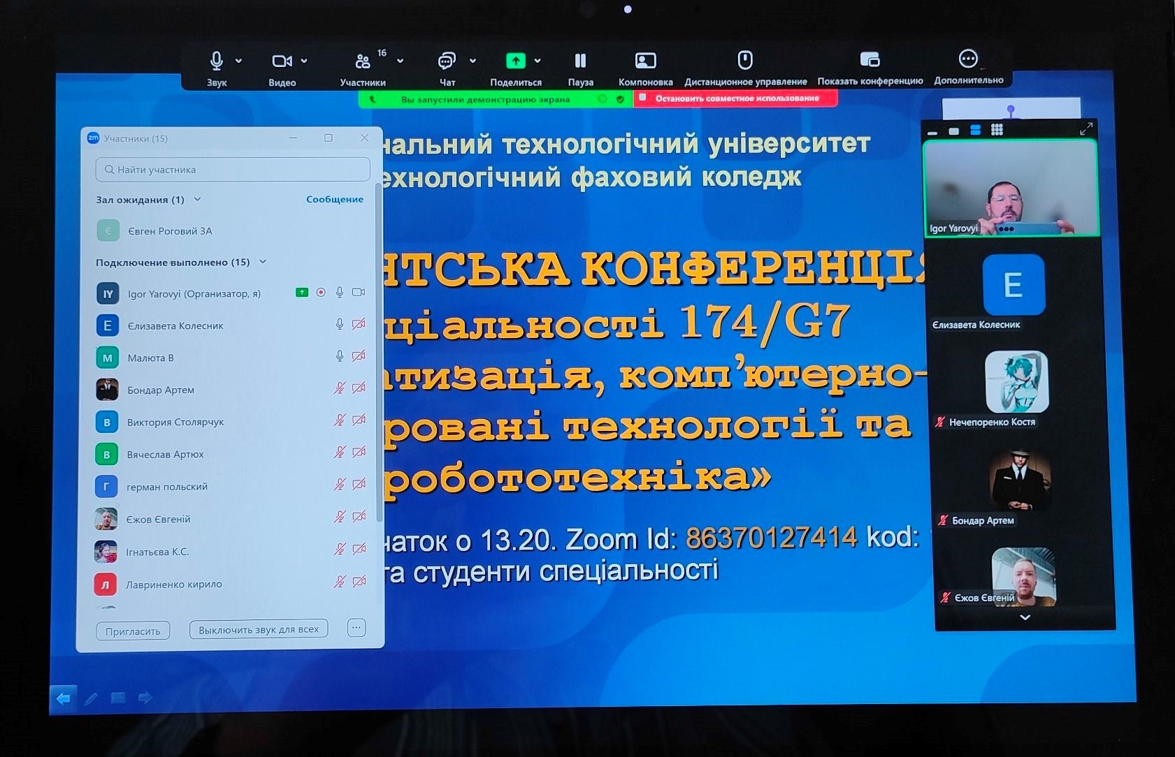 20 жовтня успішно відбулася Студентська науково-практична конференція спеціальності 174 — «Автоматизація, комп’ютерно-інтегровані технології та робототехніка». Захід пройшов у дистанційному форматі та об’єднав понад 20 учасників, з числа студентів та викладачів коледжу.