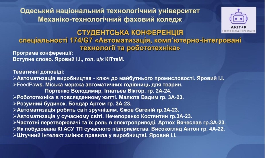 - Малюта Вадим презентував тематику «Робототехніка в повсякденному житті», розкриваючи вплив роботів на побут.