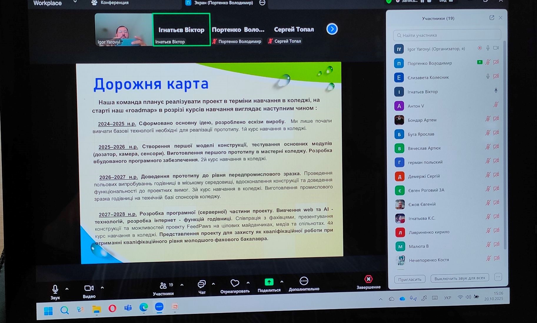 Студенти другого курсу, Ігнатій Віктор та Портенко Володимир, презентували план власного проєкту зі створення міської мережі автоматичних годівниць для тварин. Цей проєкт вже отримав високу оцінку — вони вибороли друге місце на міському конкурсі ідей. Це яскравий приклад того, як знання з автоматизації можуть бути застосовані для вирішення соціальних та екологічних проблем.
