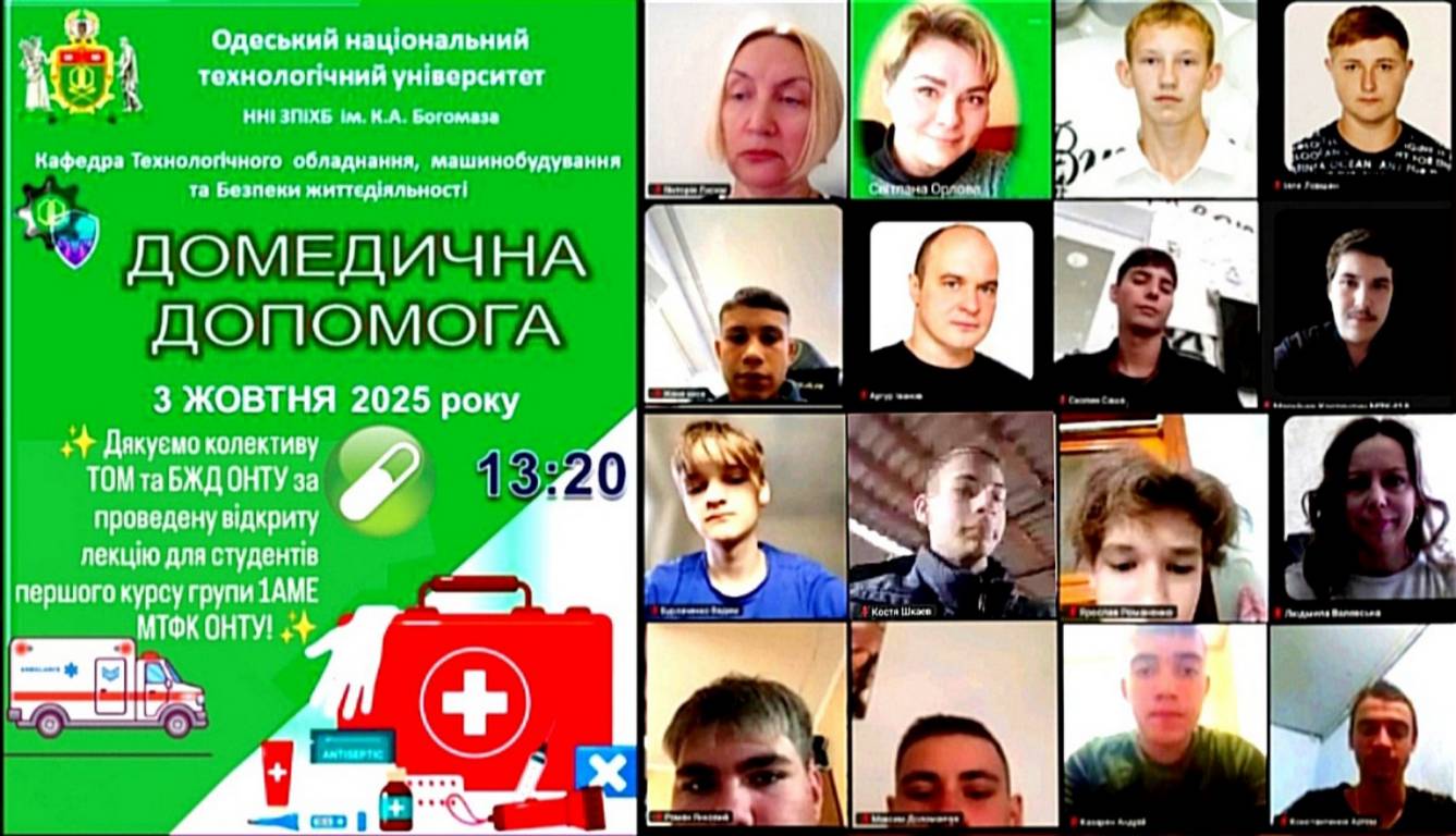 Викладачами кафедри Технологічного обладнання, машинобудування та Безпеки життєдіяльності ОНТУ для студентів першого курсу нашого коледжу, групи 1АМЕ-25, була проведена відкрита лекція за темою: «Домедична допомога».