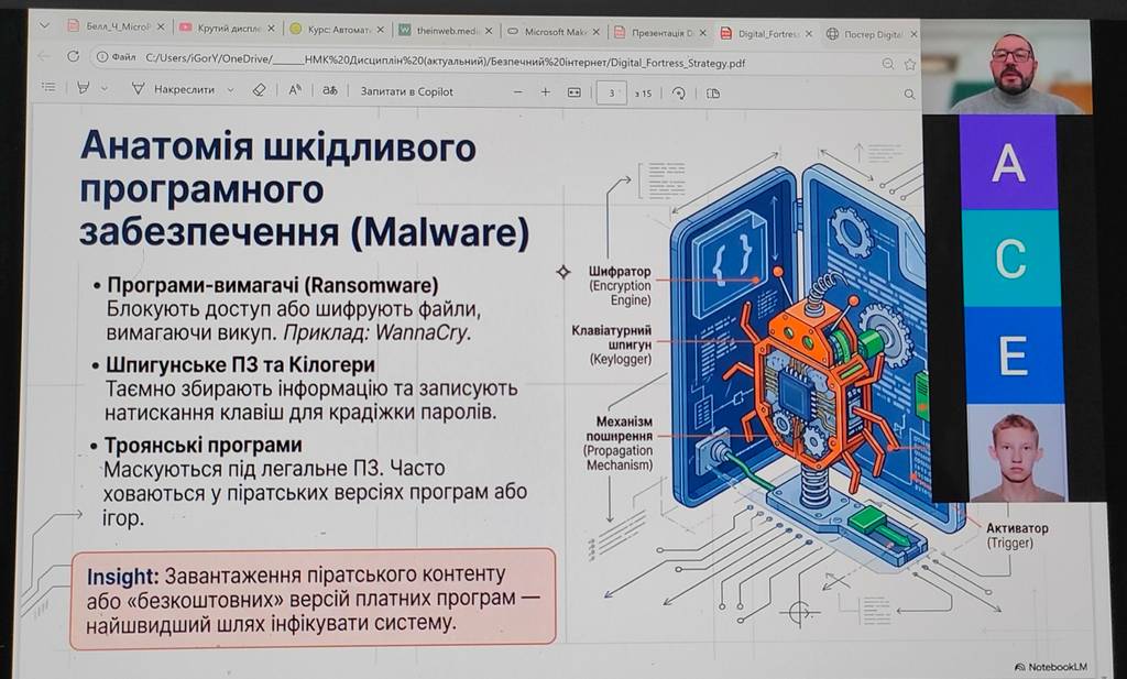Під час заходу слухачі ознайомилися із сучасним ландшафтом загроз, що включає не лише технічні атаки (віруси, DDoS), а й складні психологічні маніпуляції та гібридні загрози, такі як атаки «людина посередині». Особливу увагу було приділено «анатомії» шкідливого ПЗ: від програм-вимагачів до прихованих кілогерів, що викрадають паролі. Лектор наголосив, що саме використання піратського контенту є найкоротшим шляхом проблем з безпекою особистих даних.