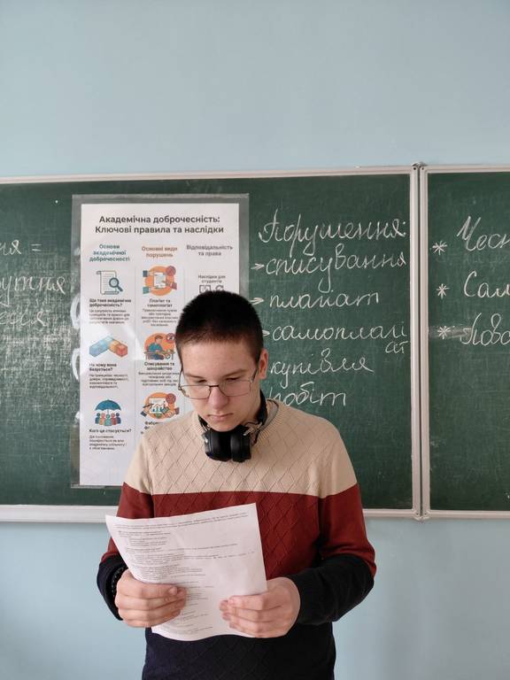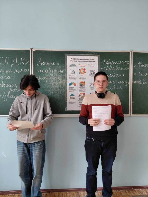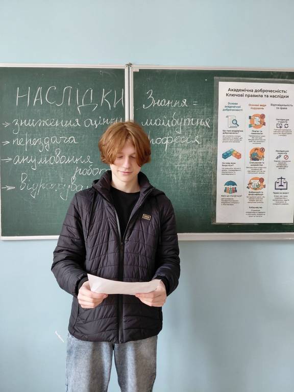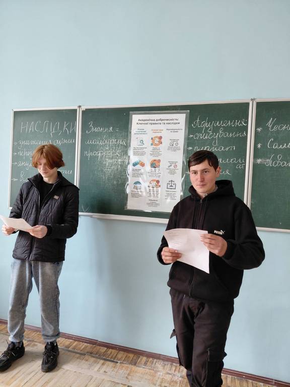 Під час заходу здобувачі освіти ознайомилися з основними принципами академічної доброчесності, зокрема чесністю, довірою, справедливістю, повагою та відповідальністю. Особливу увагу було приділено таким поняттям, як плагіат, списування, фальсифікація та академічне шахрайство, а також їх наслідкам.