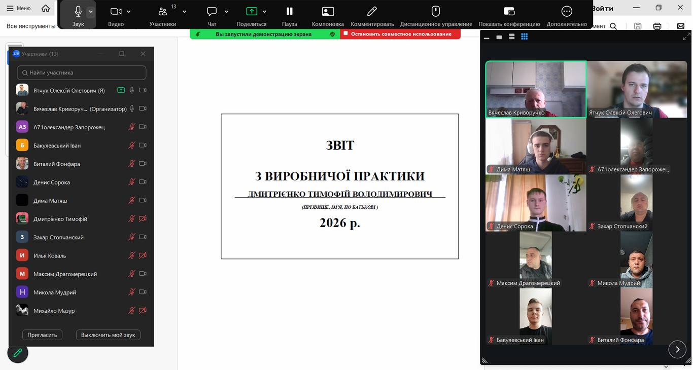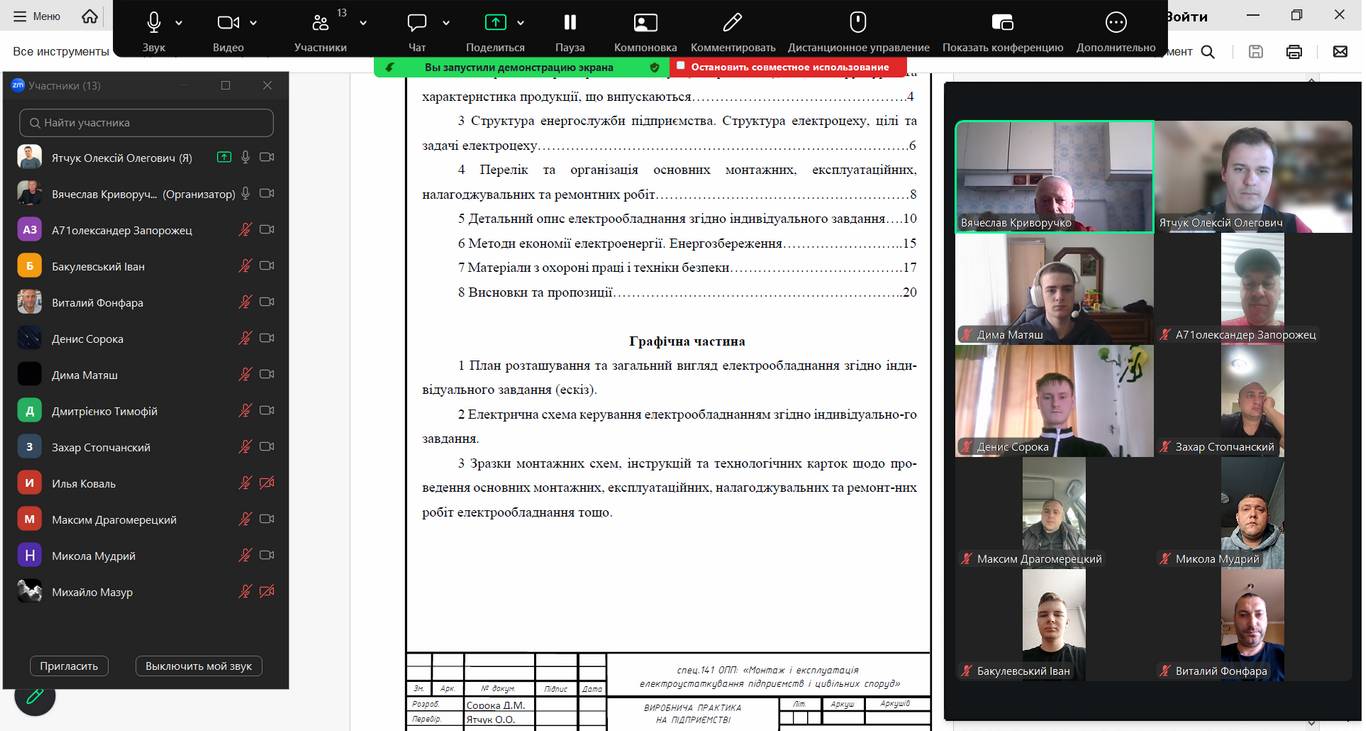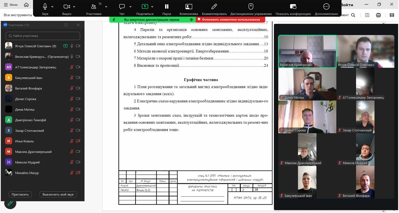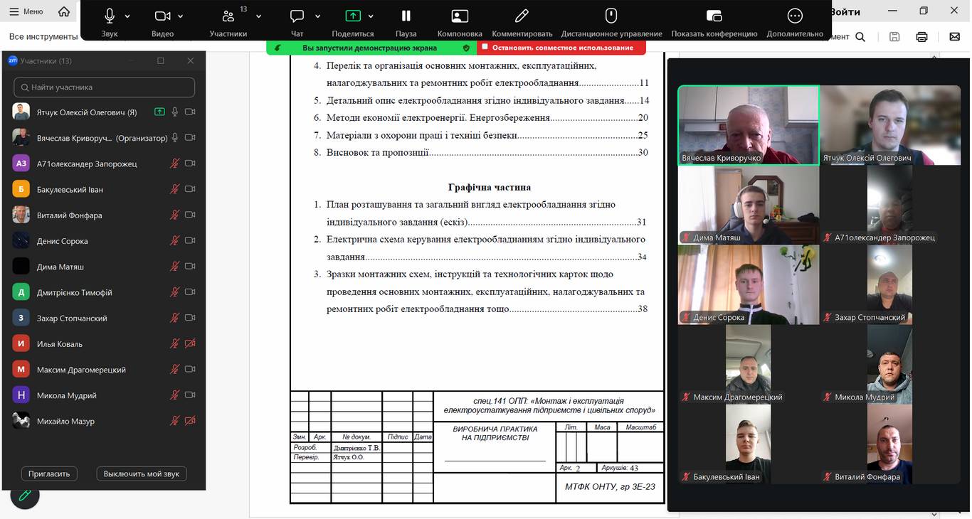 Виробнича практика є невід’ємною складовою освітнього процесу та базовим етапом для опанування первинних професійних навичок за обраним фахом. У Механіко-технологічному фаховому коледжі Одеського національного технологічного університету відбувся захист звітів з виробничої практики здобувачів освіти групи 3 Е-23, які навчаються за спеціальністю 141 «Електроенергетика, електротехніка та електромеханіка» за освітньо-професійною програмою «Монтаж і експлуатація електроустаткування підприємств і цивільних споруд». Захист проходив перед комісією, до складу якої увійшли керівники практики Криворучко В.М. та Ятчук О.О., а також завідувачка навчально-виробничої практики Лукашова О.Д. Під час заходу здобувачі представили щоденники та звіти, детально розповіли про діяльність підприємств та установ, на яких вони проходили навчання під безпосереднім керівництвом провідних фахівців виробництва. Студенти проаналізували обсяг виконаної роботи та продемонстрували рівень набутих професійних компетенцій. Практична підготовка здійснювалася як на підприємствах, з якими коледж підтримує багаторічне партнерство, так і за індивідуальними угодами з організаціями, які студенти обрали самостійно, а їхня відповідність вимогам була офіційно затверджена радою роботодавців на пленарному засіданні. Такий формат виробничого навчання є одним із ключових етапів формування фахівця та важливою сходинкою на шляху до успішної професійної кар’єри.